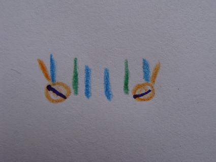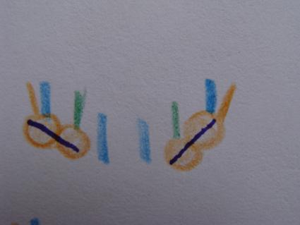 Začneme žltou bavlnkou uzlik vpravo (na lavej strane) a uzlik vlavo (na pravej strane) na modré bavlnky