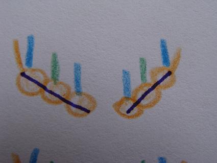 Posledný uzlik spravíme doprava s oranžovou ktorá išla z lavej strany na oranžovú ktorá išla zpravej strany a takto opakujeme aj ostatné riadky.