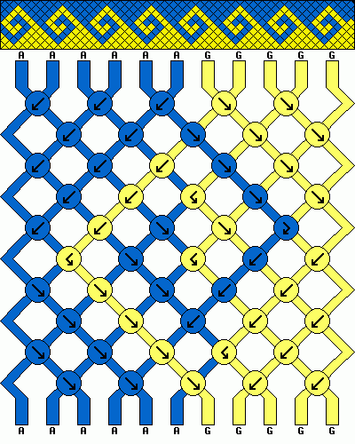 V tomto náramku sú používane ripsové uzliky viazané vpravo a vľavo. Vysvetlivky sú uvedené nižšie.